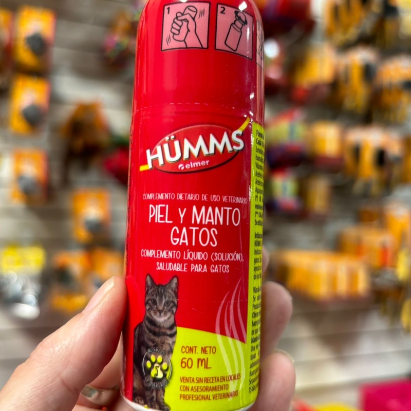 Hümms Elmer Piel y Manto Gatos, está indicado como complemento dietario para gatos. Es una combinación de ingredientes que ayuda a mejorar el estado y la piel de los gatos